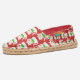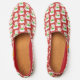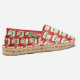 This awesome pair of patterned espadrilles features a graphic design image of a lucky oriental white waving cat. The cat has beautiful gold eyes and is wearing a gold medallion on the collar around its neck. The cat has pink ears and whiskers. This cute little kitty is holding a golden token with green jade inlay and a message in golden text that says "Good Luck".