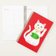 This awesome Chinese New Year planner features a graphic design image of a lucky oriental white waving cat. The cat has beautiful gold eyes and is wearing a gold medallion on the collar around its neck. The cat has pink ears and whiskers. This cute little kitty is holding a golden token with green jade inlay and a message in golden text that says "Good Luck".