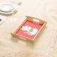 This awesome serving tray features a graphic design image of a lucky oriental white waving cat. The cat has beautiful gold eyes and is wearing a gold medallion on the collar around its neck. The cat has pink ears and whiskers. This cute little kitty is holding a golden token with green jade inlay and a message in golden text that says "Good Luck".