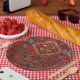 Oriental rug design in red and blue - an antique image is PRINTED on this paper plate - illustration from an antique book- it was edited and applied on this item by Alma Wad .