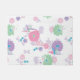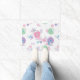 A doormat with a Japanese design of origami paper cranes and flowers in pink, purple, green, and blue, against a paper texture background.