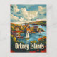 A captivating vintage portrayal of the Orkney Islands, an archipelago off the northeastern coast of Scotland, known for its rugged landscapes, ancient history, and maritime heritage. The design features the islands' dramatic cliffs, serene beaches, and historic sites such as the Ring of Brodgar and Skara Brae, all rendered in a nostalgic style. This artwork evokes the timeless beauty and cultural richness of the Orkney Islands, inviting viewers to explore their unique charm and storied past.