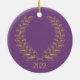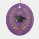 Ornament shown with a graduation cap print in colors of purple and gold.