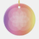 Two concentric circles of differing transparencies are replicated in each of the four corners compass directions. The overlapping of these circles creates a "flower petal" design of various shades. Background is vertical bands of rainbow colors in yellow, orange, red, pink, and purple, that melt in to one another.