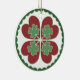 Folksy yet stylish circular ornament with our Lucky In Love Hex design. With a touch of Irish luck and blessings, quadruple shamrocks in green float over a shamrock-like arrangement of red hearts, a perfect combination for luck and love for couples. The four red hearts evoke passion and lust for one's TRUE love. While the shamrocks are a traditional sign of good luck, the green shamrocks in an arrangement of four also represents long-term growth and lasting success for the relationship. Green scalloping around the edge stands for "smooth sailing" on the ocean waves of life.