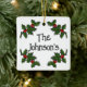 Green holly branches with red berries sit in all four corners, framing the text in the center. One Side says "Merry Christmas", the other "The Johnson's". Both sides may have text customized.
