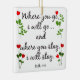 Personalized ornament with Scripture Verse on Marriage (Ruth 1:16) "Where you go, I will go...and where you stay, i will stay." Black text, with Red Heart Flowers. Cusomize the ornament with the couples' names and anniversary date on the back of the ornament.