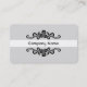 A stylish attractive business/profile card template decorated on the front with ornamental floral elements and a white center band. Company Name on the front with name and contact details on the back placed within a wider white banded area. Customizable and suitable for may types of business.