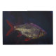 The image is a photograph of an ornamental fish, possibly a species of Barbus barbarus, commonly known as a "Bumese river barb" or "orange globe", with shiny purple scales and orange fins swimming from left to right at center in a dark, blue, shadowy aquarium with subtle bubbles rising behind the fish and just out of focus in the background.