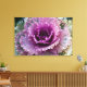 This stretched canvas features a closeup of a purple and white ornamental kale. Ornamental kale and cabbage make great borders and provide fall and winter colors to gardens and landscapes.