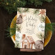 A gathering of rustic ornaments and firs headlines this boho style holiday party invite.