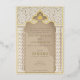 This beautifully designed wedding invitation card exudes opulence and tradition with its architectural lace design and foil accents. The front of the invitation displays a stunningly intricate pattern that draws inspiration from the grand arches and columns of Islamic architecture, brought to life in a rich palette of gold, cream, and ivory. The back complements the front with its own detailed artwork, harmonizing to create an invitation that is not only a prelude to the wedding but also a cherished keepsake. This card is perfect for couples who wish to honor their heritage while making a luxurious statement.