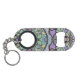 Monogrammed bottle opener with art deco ornamental pattern in pastel purple and green.