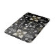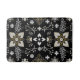 Ornate black and white floral pattern with gold accents. Central symmetrical flower surrounded by leaf motifs and intricate branches. Elegant, decorative design.