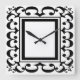 This elegant, decorative black and white clock features an ornate abstract curlicue pattern surrounding a central square.