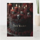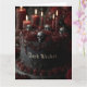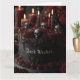 A luxurious and intricately detailed gothic cake, featuring smooth black frosting adorned with elaborate, deep red buttercream roses and other floral piping. The cake is topped with several small, metallic skulls and lit red candles that cast a warm, flickering glow. Emblazoned on its side in an elegant gold script is the phrase "Dark Wishes." The entire scene is shrouded in a dark, moody atmosphere, surrounded by more candles and roses, making it a perfect centerpiece for an alternative birthday celebration, a Halloween party, or any event with a dark fantasy or macabre theme.