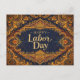 This luxurious Labor Day design draws inspiration from classic ornamental textiles and vintage bookbinding. Set against a rich navy background, intricate floral and scrollwork patterns in gold, teal, and warm red frame the message “Happy Labor Day” in refined serif typography. The symmetrical, tapestry-like composition conveys craftsmanship, tradition, and enduring beauty—honoring the artistry and skill behind meaningful work. With its rich color palette and elegant detailing, this card has a timeless, heirloom quality.