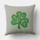 Stylish pillow features swirly green Celtic shamrocks pattern on one side with single large shamrock on the other.