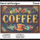 Vintage Coffee Typography Sign with Ornate Gold Lettering and Retro Teal Background, decorative café style artwork for decoupage and furniture upcycling. This bold and decorative coffee design features large antique gold lettering set against a rich distressed teal background. Ornate flourishes in warm coral, turquoise, and muted gold frame the composition, giving it a classic café sign aesthetic with a handcrafted vintage feel.