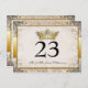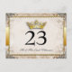 Ornate Fairytale Wedding Table Number Cards. Featuring regal royalty colors of gold and silver and pearlescents. This classy and sophisticated fairytale wedding table number postcard is great for any theme wedding or black tie wedding. Bringing a touch of elegance and charm you will send greetings to your guests in utter style with this fairytale wedding thank you postcard for all your guests. Has faux pearls and diamonds on the flourishes that are in the corners. A royal crown sits in the bottom right adorned with gold and jewels. A filigree illustration sits atop a vintage background and an ornate border holds the ornate paper textured middle. Matching products can be found in the wedding section of my store.