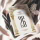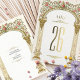 This elegant Victorian wedding invitation features a grand gold arch adorned with climbing vines of pink roses and delicate greenery. The intricate floral details and classic column design exude timeless sophistication and romantic charm. Perfect for couples seeking vintage-inspired wedding stationery with a luxurious aesthetic and a touch of floral elegance.