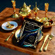 This wedding card design showcases an ornate, golden frame with intricate floral and botanical details, creating a regal and luxurious feel. The deep black background is contrasted by flowing teal and dark blue ribbons adorned with delicate gold patterns, adding a touch of elegance and sophistication. The art style blends classical and modern elements, with a focus on opulent detailing and rich color contrasts, making it a perfect choice for a formal and grand wedding celebration. Personalize the text regarding the names and details of the wedding. You can download the card to your mobile device or computer. I designed the card with the help of generative ai.