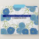 This customizable file folder is a perfect blend of functionality and style. It features a delicate and artistic design, adorned with intricate blue flowers beautifully contrasted against a white background. The flowers are detailed and vibrant, adding a touch of nature to your workspace. Complementing the floral design are green leaves and swirling grey patterns that add an element of elegance to the overall design. A personalized name is elegantly inscribed across the center in a sophisticated font, indicating customization. This personal touch transforms the folder from a simple office supply into a stylish accessory.