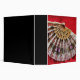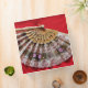 Beautiful photograph of a fancy elegant hand held folding fan evoking memories of a time long ago. Made with delicate fancy lace. Pink and orange flowers adorn this fragile accordian style fan. Ornate patterns decorate the base of the fan made of a thin gold colored metal and soft wood or perhaps bone to give the fan it's structure. The fan is resting on a beautiful red cloth and gives it an east asian flair. These type of fans were popularized by both southern belles and japanese geishas.