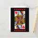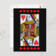 This postcard has an ornate heart queen from a deck a playing cards with rows of bright red hearts on the top and bottom on a black background.