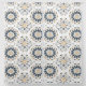 This image features a seamless, ornate mandala-style pattern with intricate, layered floral motifs. The design incorporates shades of navy blue, soft gold, gray, and white, arranged in a symmetrical, radial form. Each "petal" is detailed with fine line work, dots, and shapes that give the design a sense of depth and elegance, creating a harmonious and balanced appearance. The pattern would work well for wallpaper, fabric, and curtains