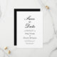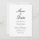 This classy formal wedding save the date card features elegant, ornate black script and small capital fonts on a white background. The reverse is solid black.