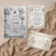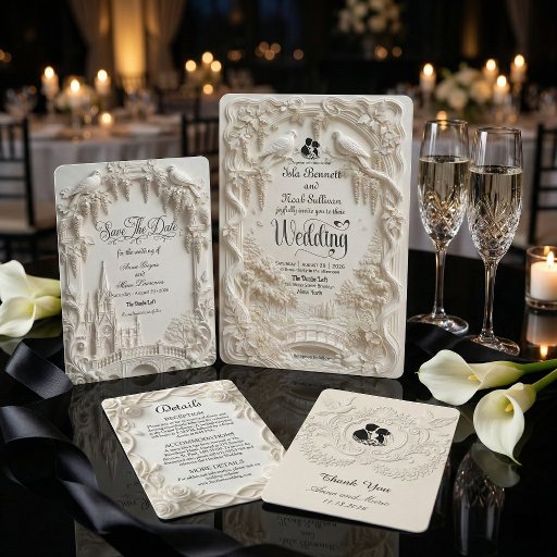 Transport your guests to a timeless era with this sophisticated design featuring a romantic garden scene in a stunning monochromatic palette.This design features a highly detailed, digitally created illustration of a formal garden landscape. The artwork simulates the look of a sculpted ivory carving or bas-relief, utilizing shadow and light to create a faux 3D appearance in shades of cream, beige, and off-white. The scene depicts a romantic bridge surrounded by lush hanging wisteria, blooming roses, and two white doves in flight. The text is presented in a stark black traditional serif paired with elegant calligraphy script for high contrast and readability against the light background.