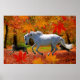 An Andalusian horse runs through Fall leaves with German Shepherd pals.