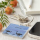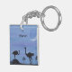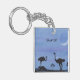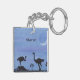 A watercolor painting of Ostriches silhouetted in the twilight adorns this customizable keychain!