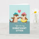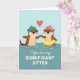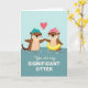 This greeting card shows two smiling otters standing waist-deep in calm cerulean water, holding hands as they gaze at each other with an affectionate, cozy look 🥰. A large crimson heart floats above them, centered in the sky area so your eye goes straight to their connection ❤️. The lighting is soft and even, giving the scene a gentle pastel feel while keeping the colors rich and easy to notice. One otter wears a teal beanie, while the other has a pink cap with a small flower that has a yellow center, adding a sweet contrast between the pair. The otter in the pink cap hugs a bright yellow swim ring, making the moment feel like a cute little date in the water. The phrase “You are my SIGNIFICANT OTTER” sits across the upper portion of the design, with the smaller words in a darker tone and “SIGNIFICANT OTTER” larger and more attention-grabbing. Beneath their bodies, thin white ripple lines curve across the water to show gentle movement.
