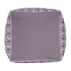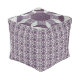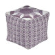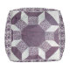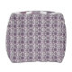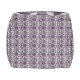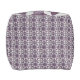 Quilt block in purple and white "spool" pattern. Eight spools rotate around a center of dark purple. A purple flower print is the "thread" on the spool, as well as the frame for each block. Top shows a large single quilt motif, sides are a smaller image replicated in six horizontal/vertical rows.