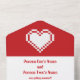 Bring touch of geeky fun to your event with this all-in-one wedding invitation and RSVP card. On the inside you will find a white pixelated heart on a bright cherry background above a section with some sample text that can be customized for your special day. The lower section of the invite features a removable, postcard sized piece that has some sample RSVP text sitting above a cherry red border with a pattern of 8-bit hearts scattered across the bottom. Outside, a similar border of video game-themed hearts on cherry can be found below the areas where you would add stamps, standard, and return addresses for both the invitation as a whole and the returnable RSVP section. The flap used to fold over and seal the card has a single 8-bit heart on a bright red background with a sample set of initials that you can customize for a final personal touch that shows off your love for gaming and each other. Be sure to check out the rest of the Our 8-Bit Hearts in Cherry set for other coordinating products, including return address labels.