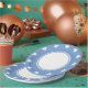 Add a fun, coordinated touch to your rehearsal dinner, bridal shower, or even a more casual geeky wedding with these paper plates, featuring a periwinkle blue rim decorated with white 8-bit hearts and a white banded center section, creating a great look for any classic video game-themed event.