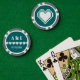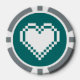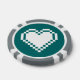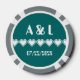 Give the guests, bridesmaids, groomsmen, or anyone else attending or helping with your geeky wedding or special event a fun treat with these customizable poker chips. One side of the poker chip features a white pixelated heart on a rich teal background. The other side has a sample set of initials and date separated by a pattern of retro video game related 8-bit hearts. The sample text can be customized with your own details or a special message of your choice to create a unique and personal token to commemorate your big day. This design will match any product from the Our 8-Bit Hearts in Teal line so that you can make your gaming themed wedding or special event as coordinated as you like.