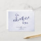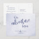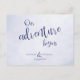 Our adventure begins blue typographic wedding announcement postcard