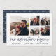 A modern and exciting engagement announcement card for the adventure-minded couple, this clean and simple design features five square photos in a grid collage layout, with "our adventure begins" beneath in hand lettered script. Personalize with your announcement, names, and additional details along the bottom.