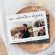 A modern and exciting engagement announcement card for the adventure-minded couple, this clean and simple design features three horizontal or landscape oriented photos in a grid collage layout, with "our adventure begins" above in hand lettered script. Personalize with your announcement, names, and additional details along the bottom.