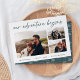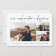 A modern and exciting engagement announcement card for the adventure-minded couple, this clean and simple design features three horizontal or landscape oriented photos in a grid collage layout, with "our adventure begins" above in hand lettered script. Personalize with your announcement, names, and additional details along the bottom.