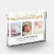 Elegant and simple birth announcement keepsake photo block with gold glitter text that says, "Our Beautiful Blessing" in hand lettering and calligraphy style font. Featuring 3 photo collage birth announcement card. Works best with portrait orientation or vertical orientation photos. Replace the photos with your own newborn photo to personalize this card.