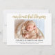 Simple and elegant "Our Beautiful Blessing" baby birth announcement card. Beautiful hand lettering and calligraphy style script font in gold/glitter. 1 photo in horizontal or landscape orientation. Replace the photo with your own newborn baby. Unisex and elegant baby announcement.