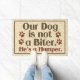 Our dog is not a biter. He's a humper. Funny dog quote design. Humorous dog saying for dog owners. In bold brown text with paw prints.