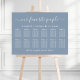 Chic dusty blue wedding seating chart foam board sign for up to 12 tables featuring "our favorite people" in an elegant white script with swashes, your names and wedding date joined together with a heart and "We're so glad you're here" in simple modern white lettering.