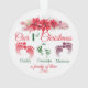 Celebrate your First Christmas as a family of 3 with this elegant Floral Poinsettia ornament. Featuring red Christmas poinsettias floral flowers with purple berries and foliage. Elegant text in red and green can be be customized and personalized as needed. A lovely special and unique ornament design for your growing family that will add a festive accent to your Christmas tree decor and a perfect keepsake for years to come.