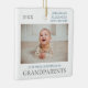Our first Christmas as grandparents ornament featuring custom photo of baby and year. Photo template via Pixabay licensed under CC0 and must be replaced with your own photo