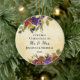 Our First Christmas as Mr & Mrs Inspirational scripture Wedding Ornament depicts beautiful rustic autumn watercolor floral purple, blue, burnt orange flowers and greenery. It is personalized with names and date of the bride and groom. The back features Bible Verse 1 Corinthians 13:13, "And now abide faith, hope and love, but the greatest of these is love."
